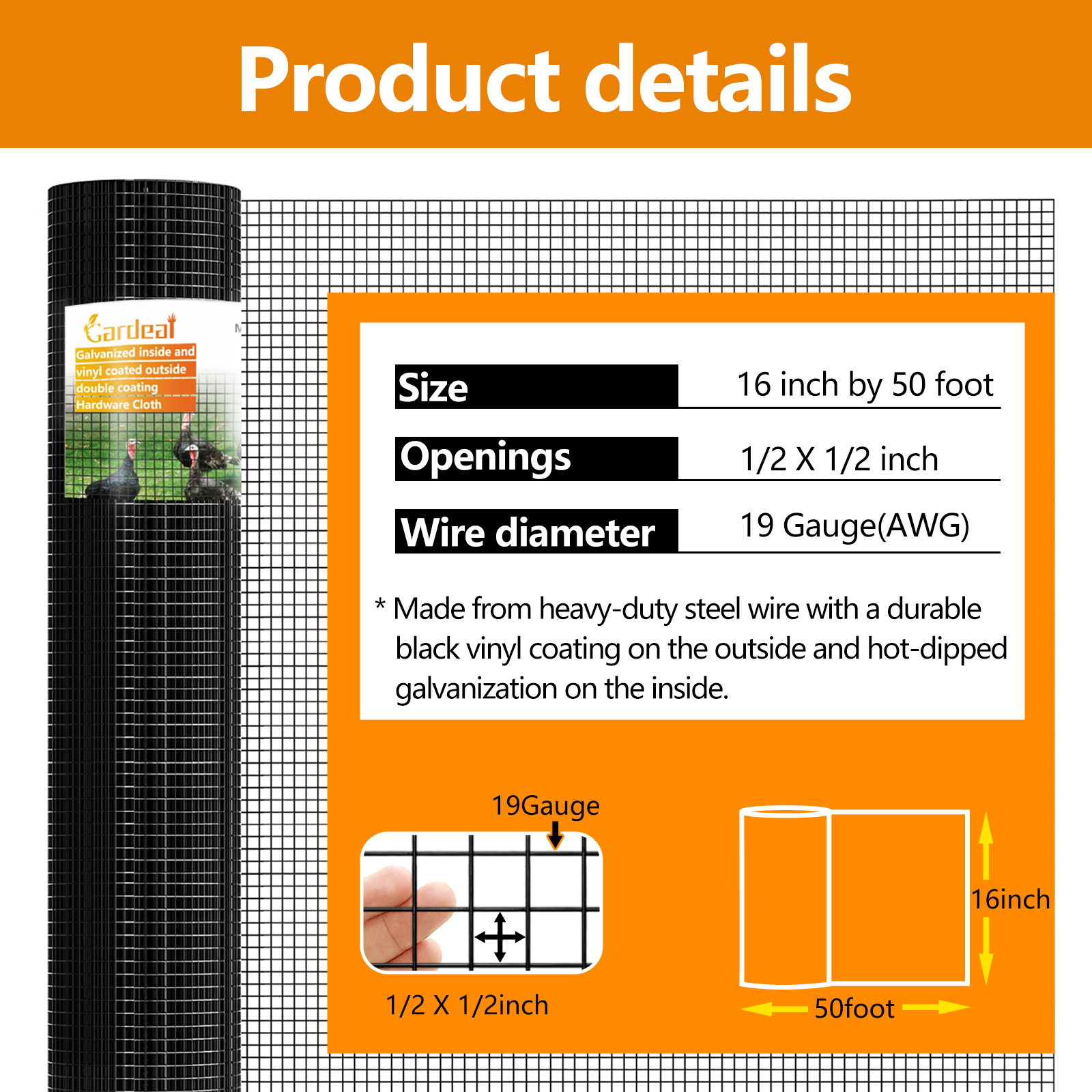 - Galvanized hardware cloth roll 48 inches x 100 foot with 1/2 inch mesh 19 gauge.